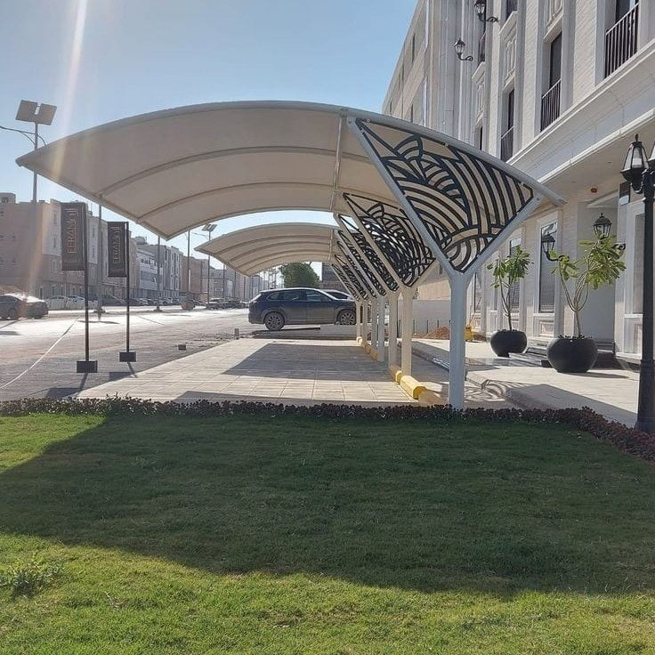 - مظلات سيارات قماش بجدة (PVC أو بولي إيثيلين) تصميم أنيق، مقاومة للحرارة والرطوبة، مثالية لمواقف السيارات في أحياء